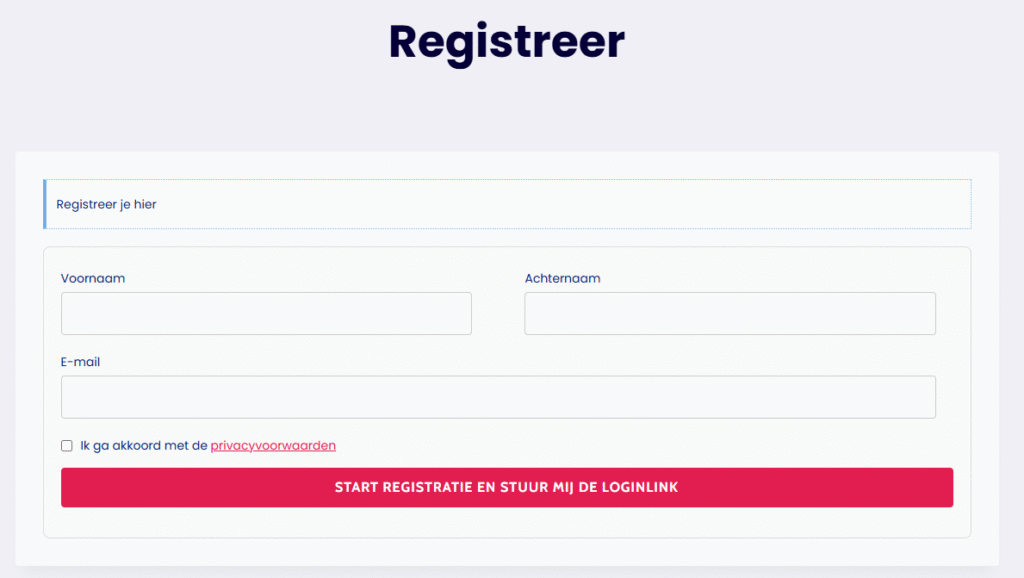 Dit is een eenmalige actie. Klik op de blauwe knop en deze brengt je naar het registratie en inschrijfformulier.